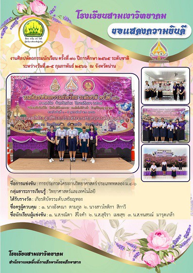 แสดงความยินดีกับนักเรียนและคณะครูโรงเรียนสามเงาวิทยาคมในการรับรางวัลในการแข่งขันศิลปหัตถกรรมนักเรียนระดับชาติ ครั้งที่ 70 ของโรงเรียนสามเงาวิทยาคม
