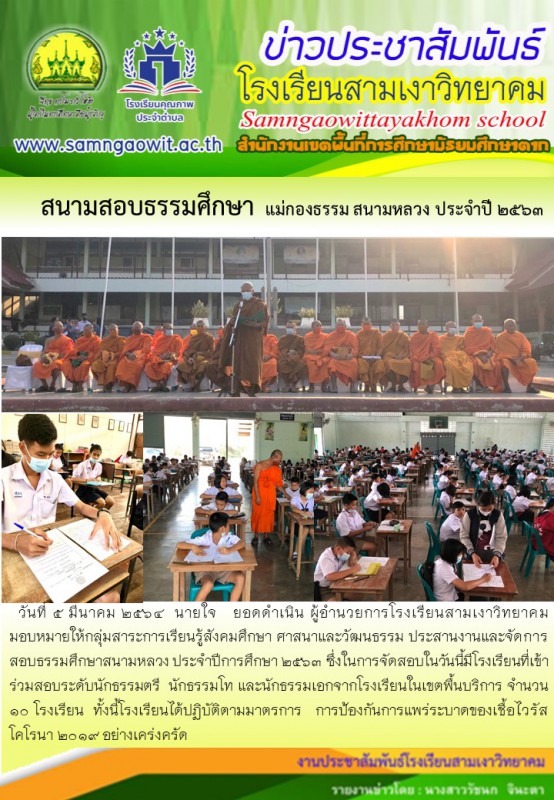 วันที่ 5 มีนาคม 2564 นายใจ ยอดดำเนิน ผู้อำนวยการโรงเรียนสามเงาวิทยาคม มอบหมายให้กลุ่มสาระการเรียนรู้สังคมศึกษา ศาสนาและวัฒนธรรม ประสานงานและจัดการสอบธรรมศึกษาสนามหลวง ประจำปีการศึกษา 2563 ซึ่งในการจัดสอบในวันนี้มีโรงเรียนที่เข้าร่วมสอบระดับนักธรรมตรี นักธรรมโท และนักธรรมเอกจากโรงเรียนในเขตพื้นบริการ จำนวน 10 โรงเรียน ทั้งนี้โรงเรียนได้ปฏิบัติตามมาตรการ การป้องกันการแพร่ระบาดของเชื้อไวรัส โคโรนา 2019 อย่างเคร่งครัด
