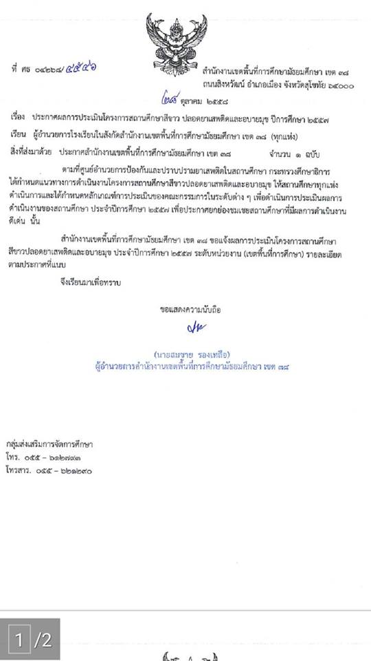 รางวัลสถานศึกษาสีขาวปลอดอบายมุข ระดับดีเด่นประจำปีการศึกษา 2557